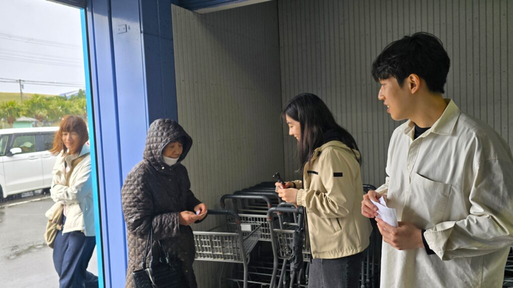 2日目は、島内で数少ない住民の集まりやすい場所である大型スーパーの出入口や駐車場に立ち、チラシを用いた教会紹介を行いました。